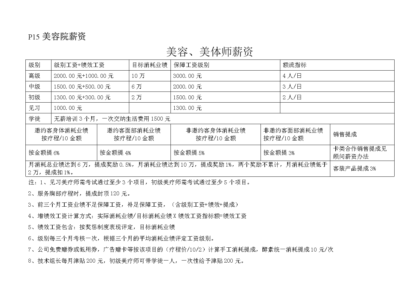 业绩提成是工资方案的重要组成部分,旨在激励员工为美容院创造更多业绩,我们根据个人业绩为基础,同时考虑团队业绩,以鼓励员工间的协作,具体提成比例根据业务类型、项目利润及员工角色来设定,以平衡个人与团队利益,激励员工积极推广业务。